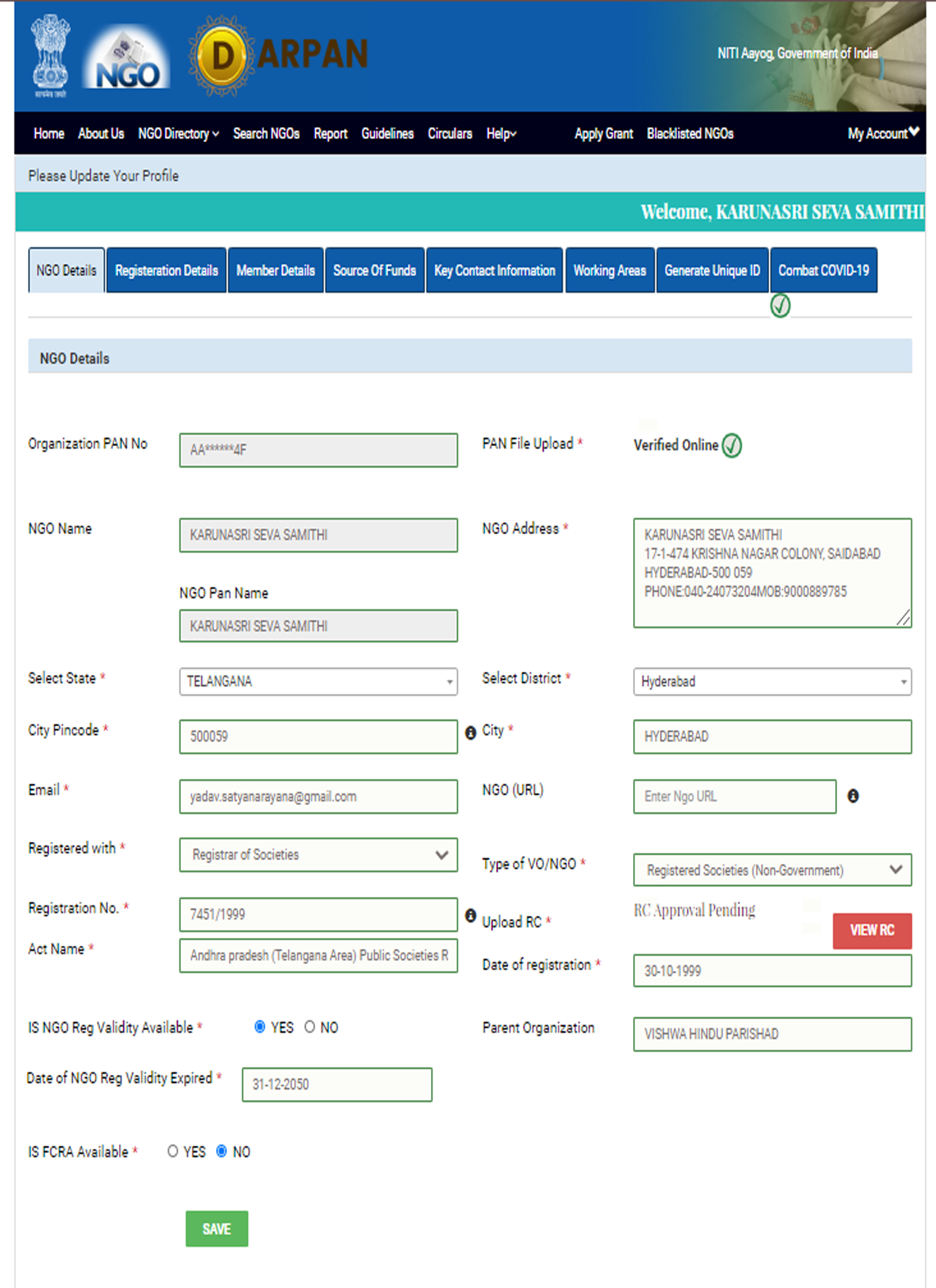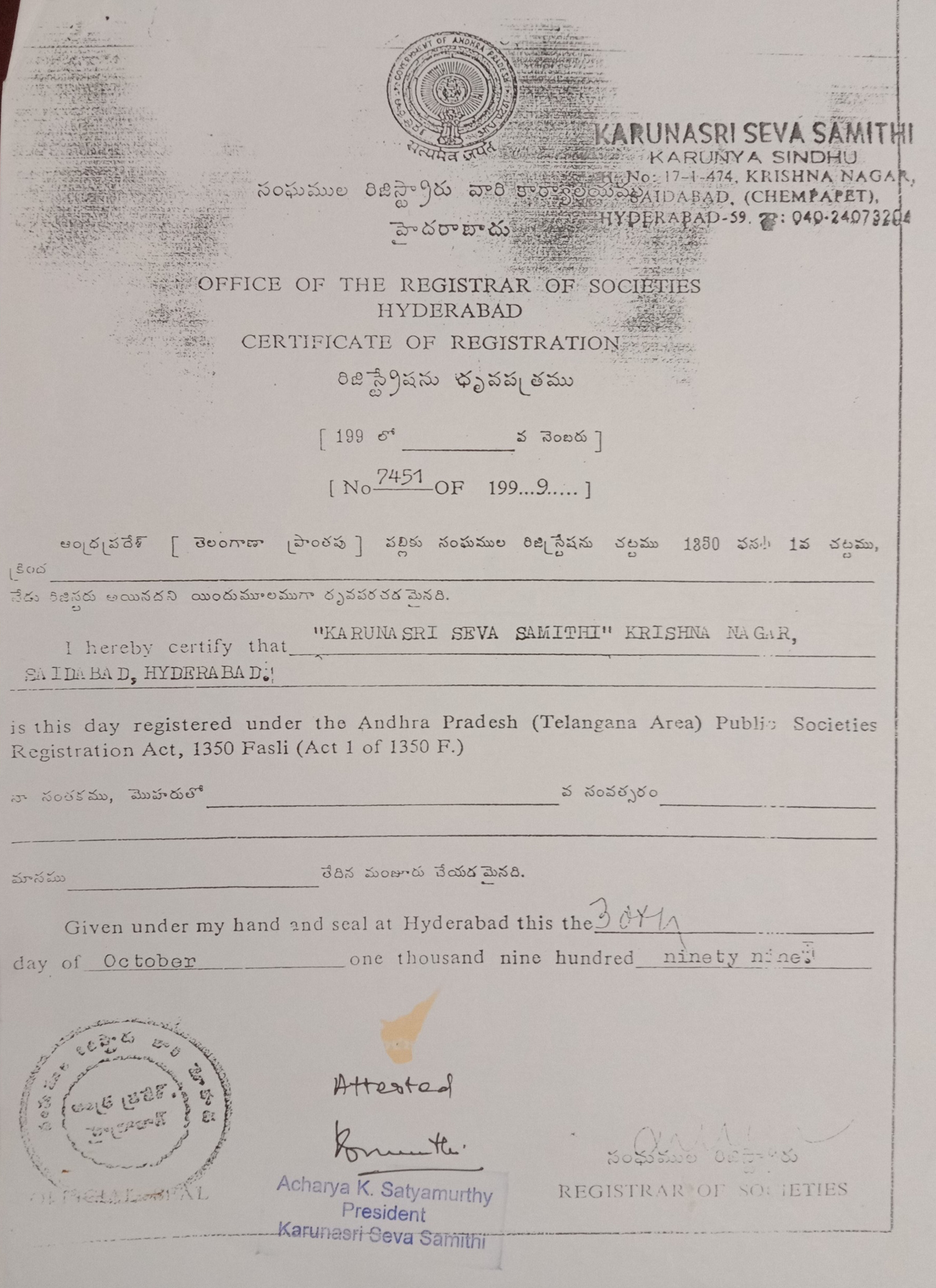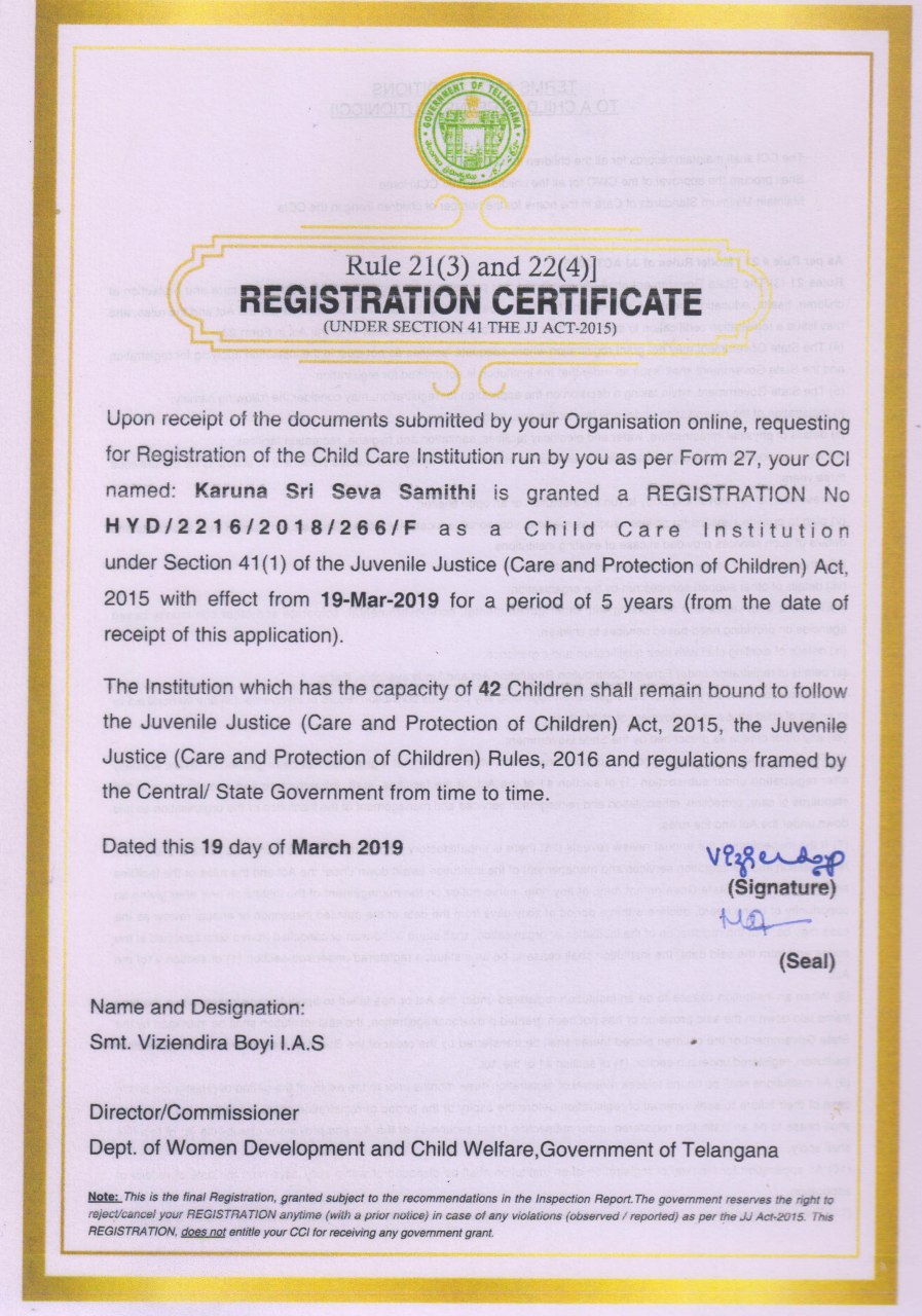 REGISTRATION CERTIFICATE ISSUED BY CHILD WELFARE DEPARTMENT, TELANGANA STATE