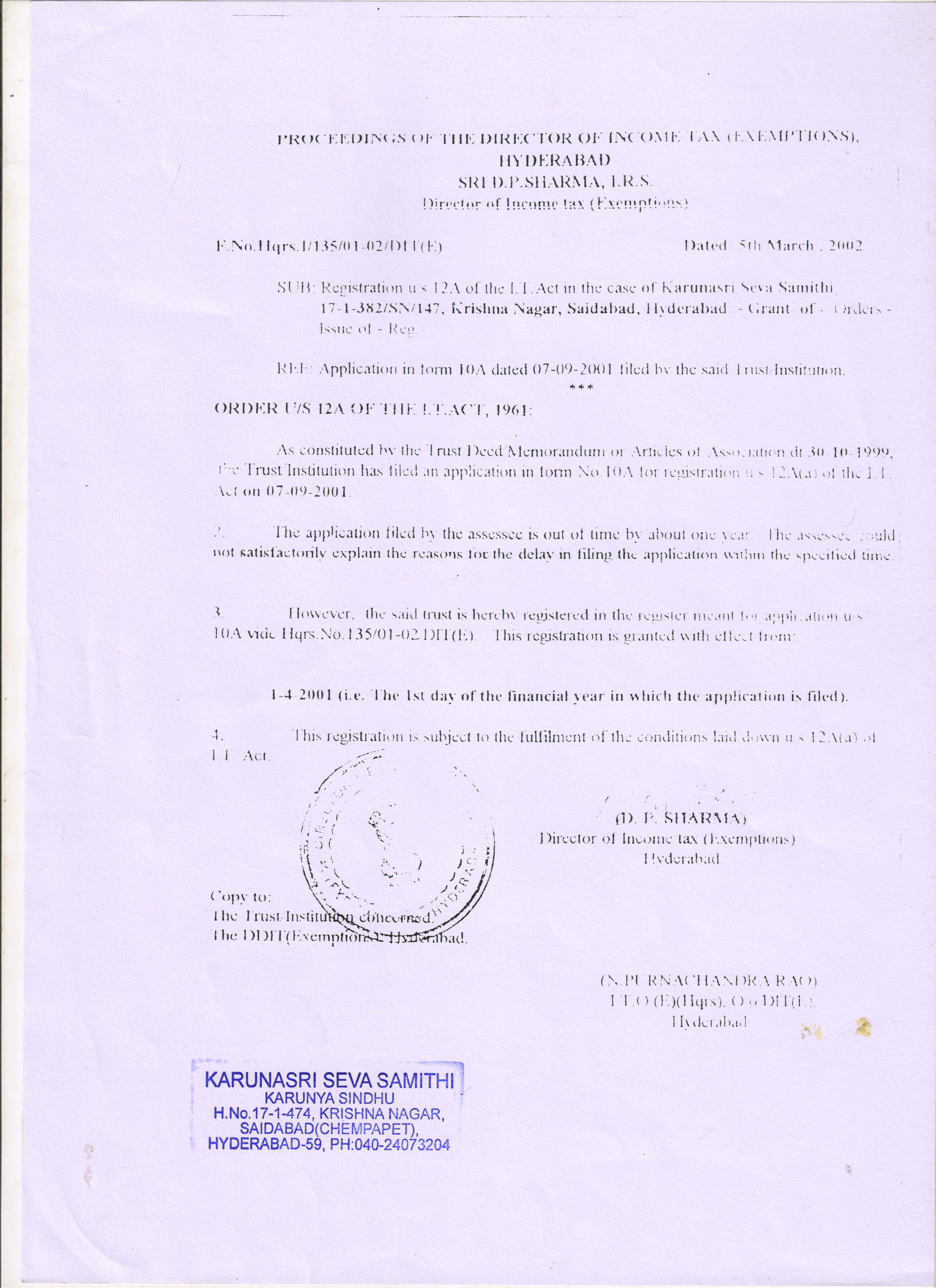 CERTIFICATE FROM INCOME TAX DEPARTMENT U/S. 12A